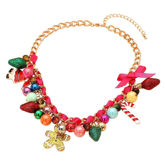 Holiday Santa Gingerbread Man Candy Cane Pearl Bow Charm Beaded Necklace: Gold Green Red