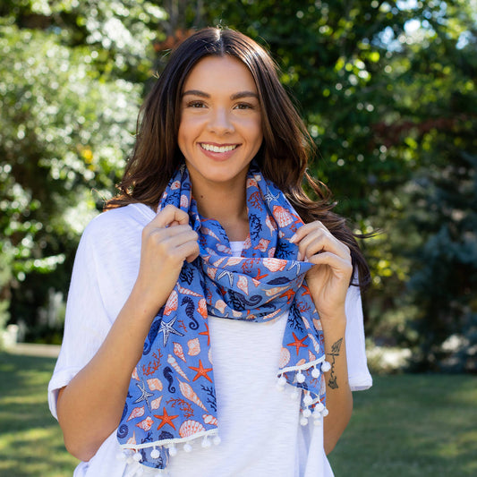 Block Printed Cotton Scarf - Seahorses, Shells, Coral Print