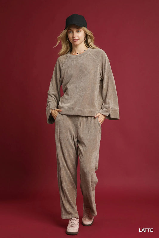 Double Take Full Size Textured Long Sleeve Top and Drawstring Pants Set
