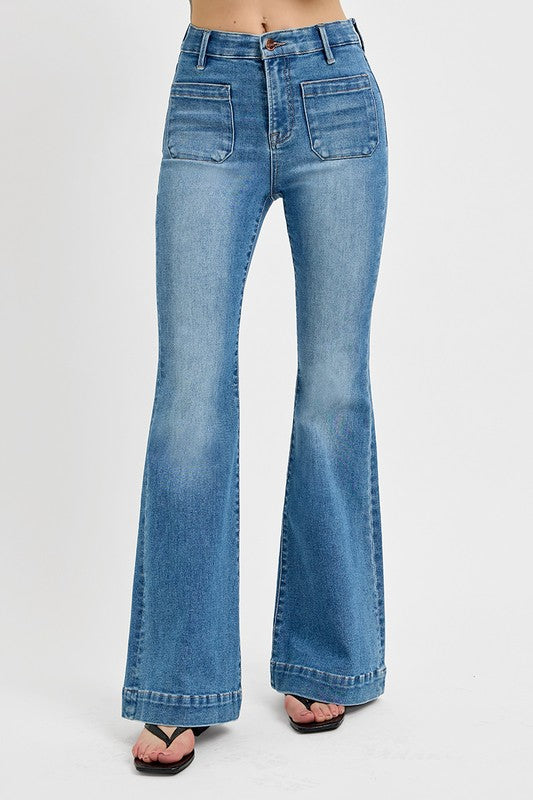 Risen Full Size High Rise Front Patch Pocket Flare Jeans
