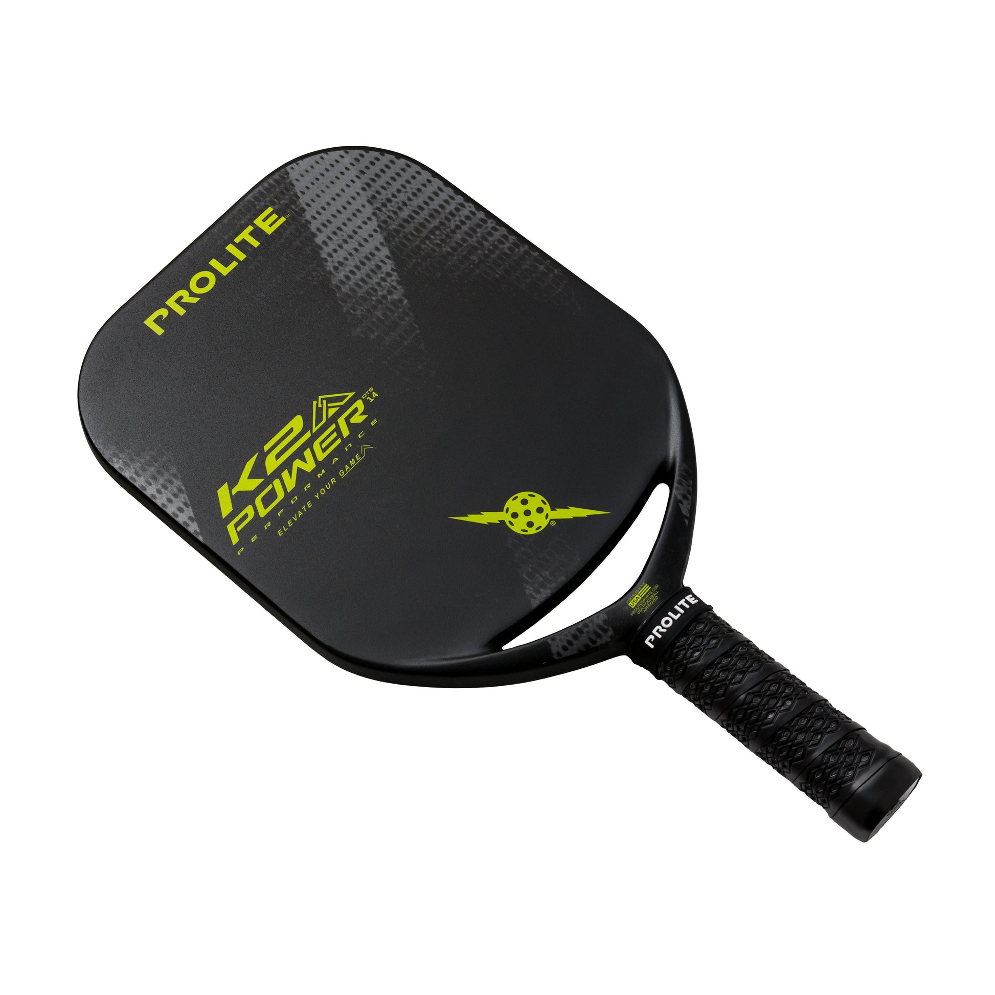 Let the new generation of Prolite, the K2 Power, elevate your game to your ultimate peak performance. Our advanced engineering process uses a 4-ply 360 degree Carbon Fiber (Toray T700) wrapping process and thermomolding to create a one-piece, unibody paddle with PermaTraction Coating. The results are a playing surface with textured feel and accelerated spin. The K2's first of its kind, reinforced carbon fiber frame, provides perimeter weighting, added strength, and vibration absorption during play. Its edgeless construction and open throat system provides a scientifically proven edge that creates less drag and quicker reflexes.